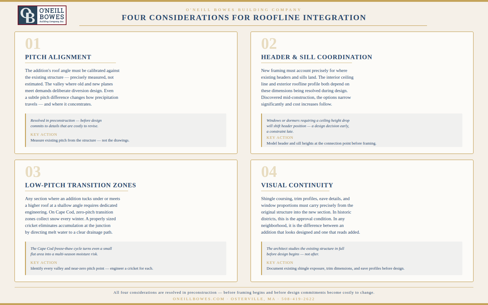 For O'Neill Bowes, these are standard preconstruction conversations. The homeowners who navigate Cape Cod additions most smoothly are the ones who arrive at the construction phase with every one of these questions already answered.
