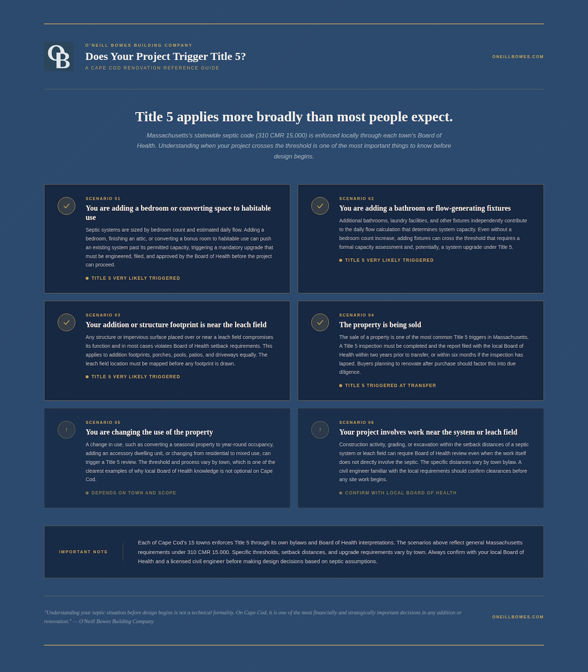 O'Neill Bowes brings 25+ years of combined high-end construction experience on Cape Cod to every project, including a deep familiarity with the town-by-town Board of Health requirements, civil engineering relationships, and local regulatory landscape that makes septic planning something we address at the first site visit rather than the last possible moment.